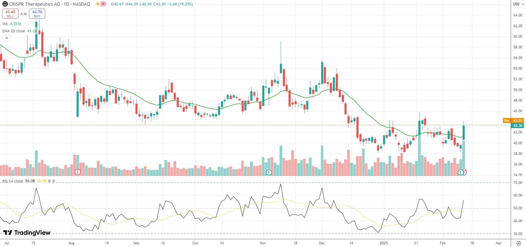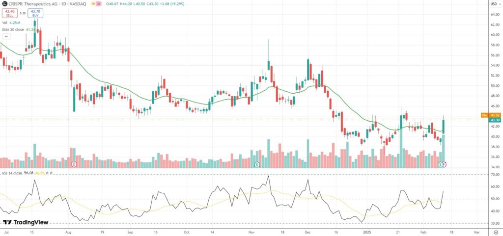 The shares of CRISPR Therapeutics AG (CRSP) closed 9.29% ($3.68) higher at $43.30 on Nasdaq on Wednesday. It has been the sharpest single-session gain for the stock since November 1st 2024.