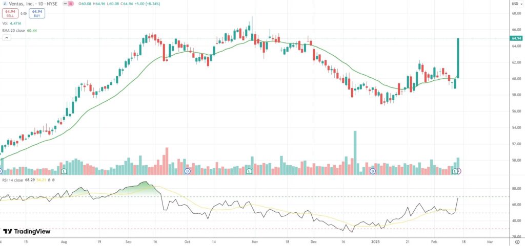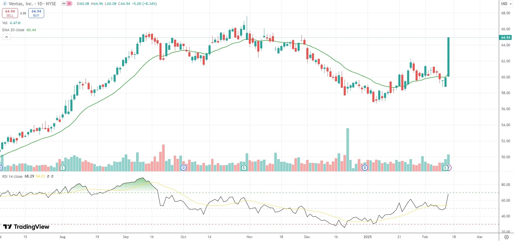 The shares of Ventas Inc (VTR) closed 8.34% ($5.00) higher at $64.94 in New York on Thursday. It has been the sharpest single-session gain for the stock since November 9th 2020.
