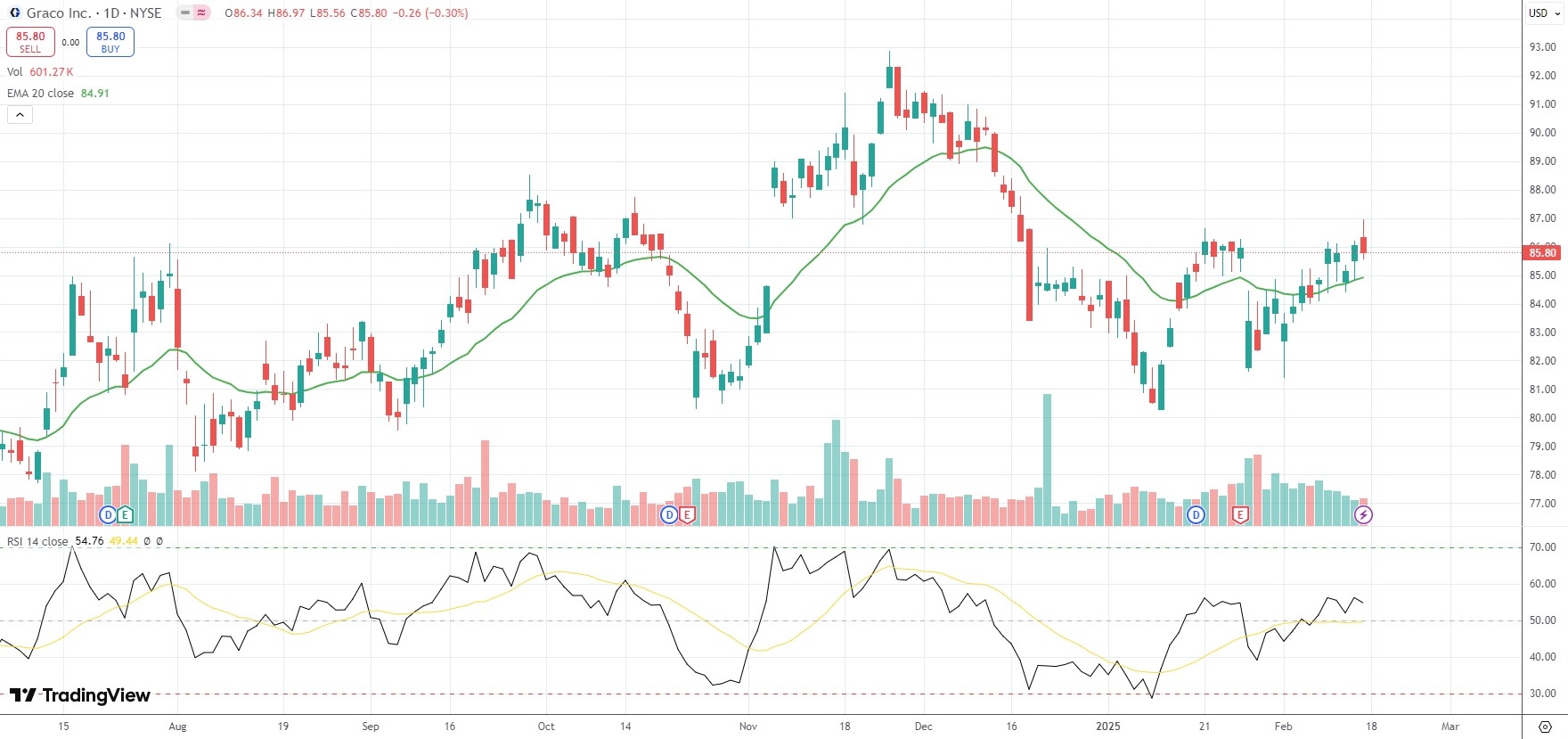 The shares of Graco Inc (GGG) closed 0.30% ($0.26) lower at $85.80 in New York on Friday.