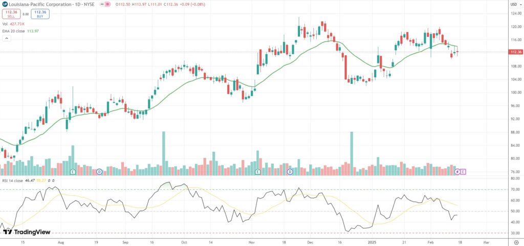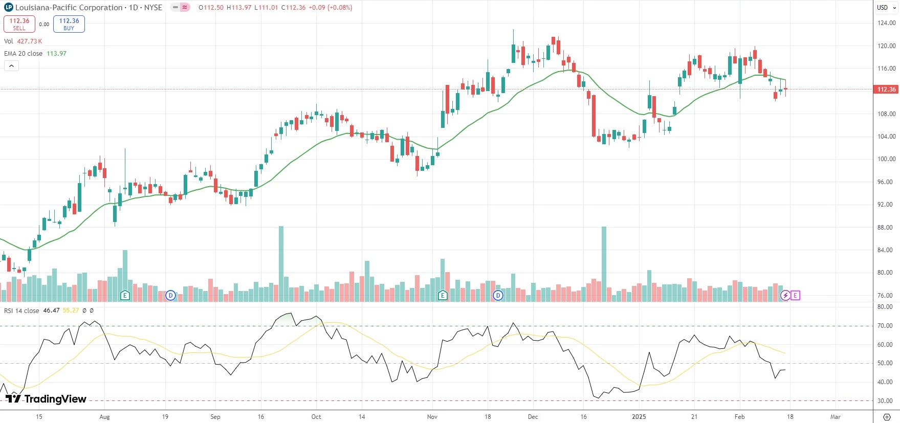 The shares of Louisiana-Pacific Corp (LPX) closed 0.08% ($0.09) higher at $112.36 in New York on Friday.
