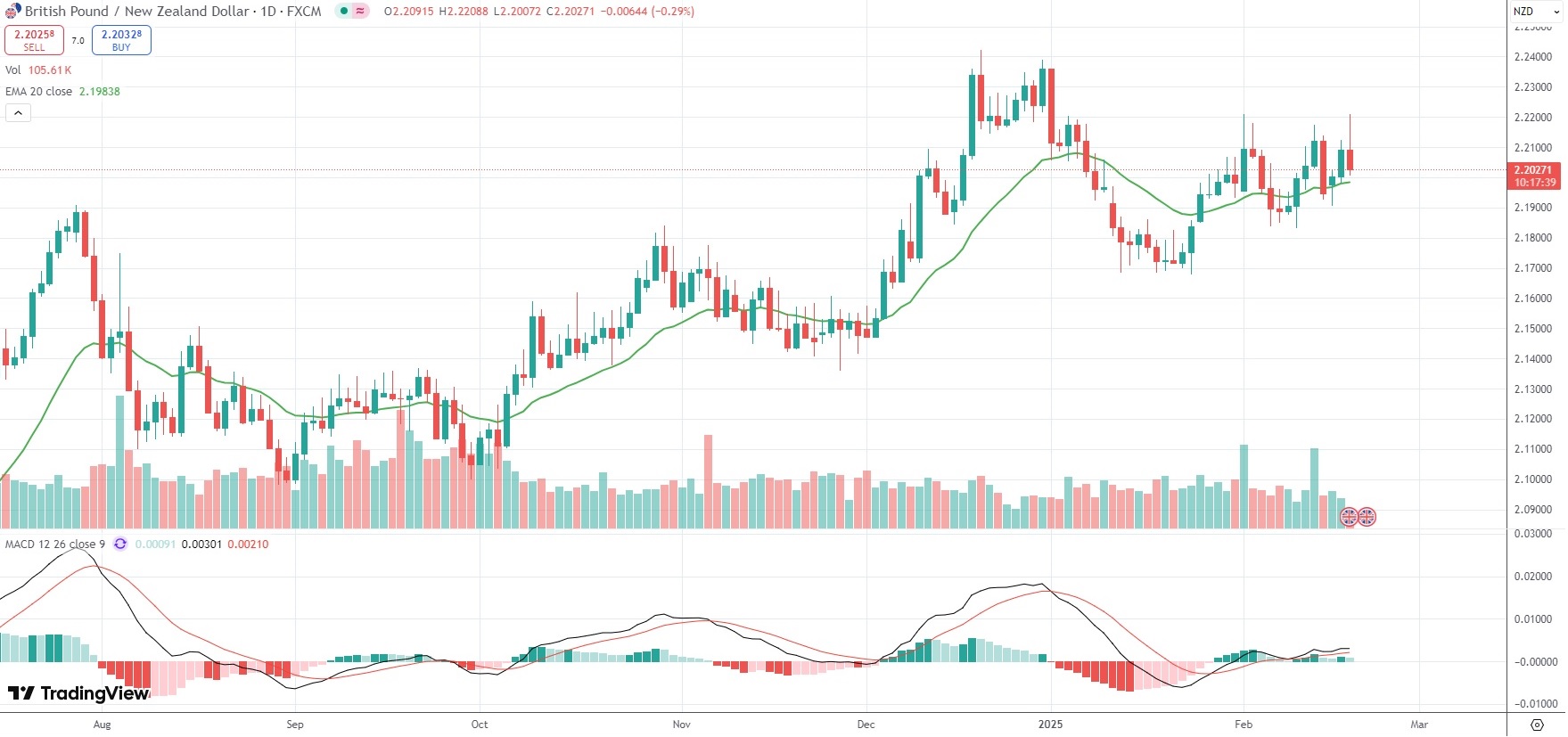 The GBP/NZD currency pair was last down 0.29% on the day to trade at 2.2027.