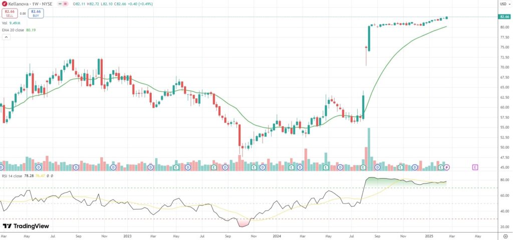 The shares of Kellanova (K) closed 0.25% ($0.21) higher at $82.66 in New York on Friday. It has been a new record high closing price for the stock.