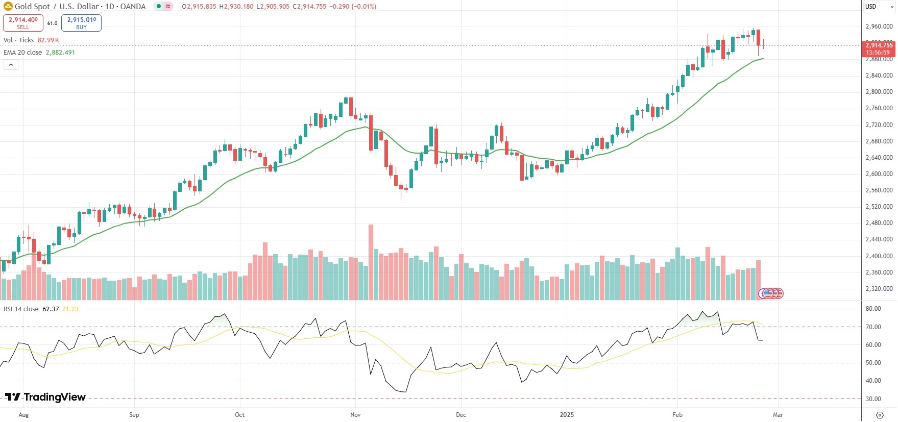 Spot Gold was last little changed on the day to trade at $2,914.75 per troy ounce.