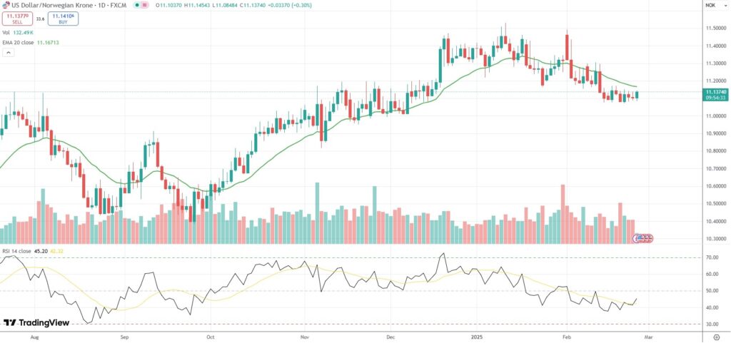 The USD/NOK currency pair was last up 0.30% on the day to trade at 11.1373.