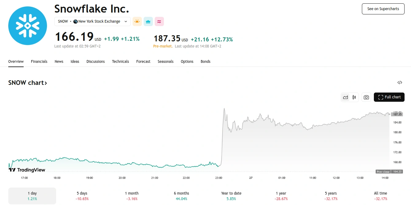 On Thursday, Snowflake’s stock experienced a significant premarket surge of 13%, driven by the company’s impressive financial performance and optimistic forecast, which exceeded analyst expectations. This boost came on the heels of the cloud software provider’s announcement of an enhanced collaboration with Microsoft, focusing on the integration of OpenAI models.