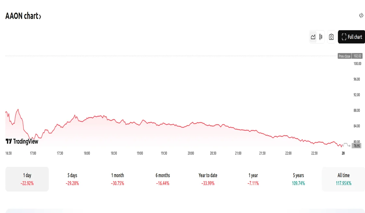 - AAON’s stock price plummeted 22.92% to $78.64 as a result of the disappointing figures.