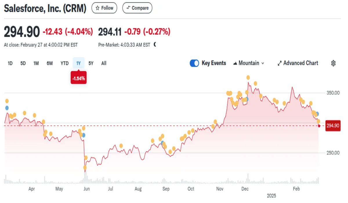 For the upcoming fiscal year, Salesforce anticipates adjusted earnings per share between $11.09 and $11.17, and revenue ranging from $40.5 billion to $40.9 billion. This outlook is slightly below the analyst consensus, which projected adjusted earnings per share of $11.18 and revenue of $41.35 billion. For the first quarter, the company expects revenue between $9.71 billion and $9.76 billion, slightly below the projected $9.91 billion. Additionally, Robin Washington is set to assume the position of Chief Financial Officer in March, replacing Amy Weaver.