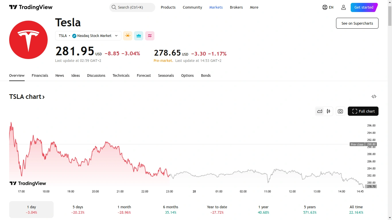 In premarket trading, shares of the electric vehicle manufacturer slightly decreased by 0.3%, reaching $280.91, while futures for the S&P 500 and the Dow Jones Industrial Average both saw increases of approximately 0.3%.