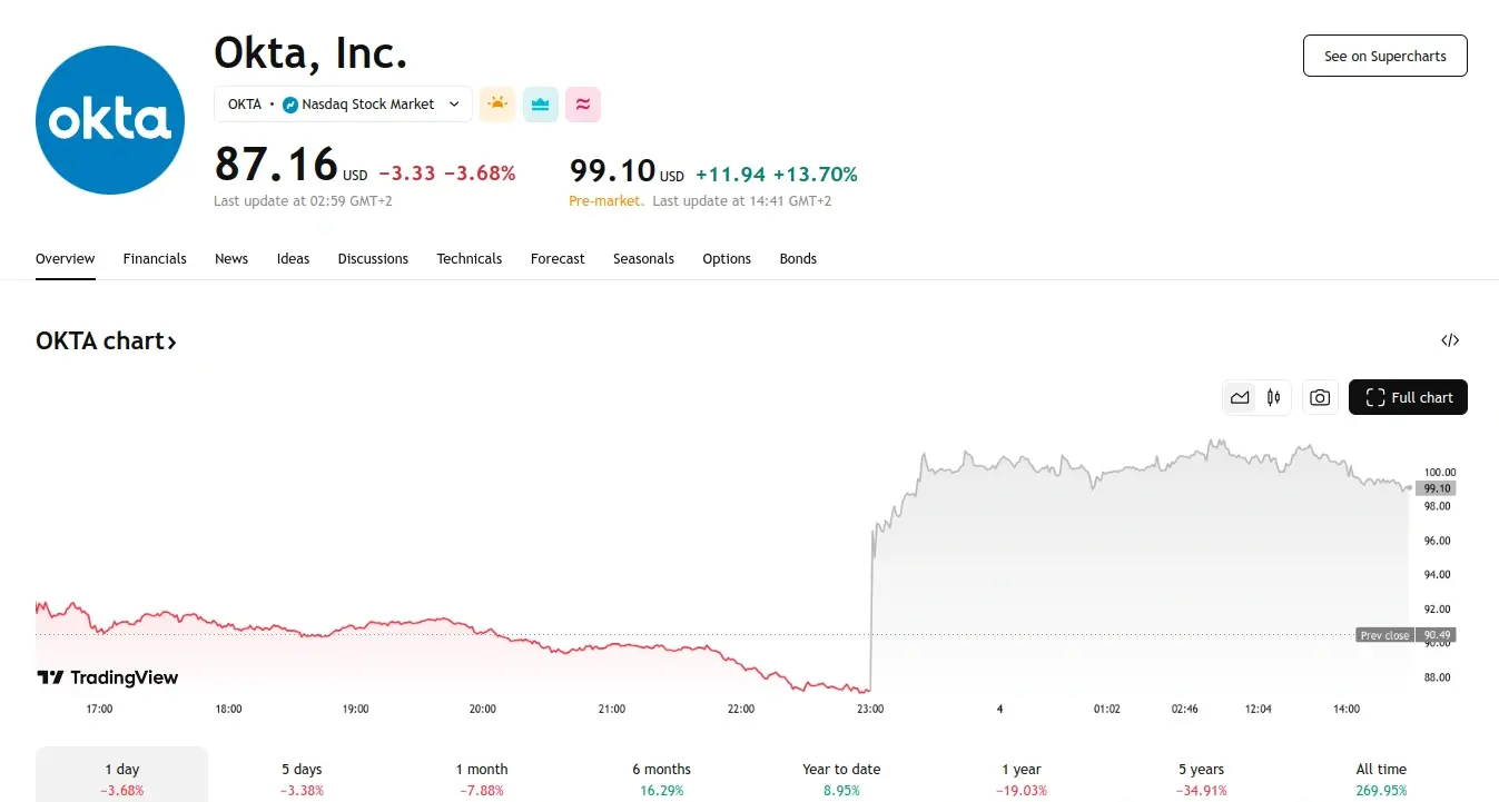 - Okta’s shares experienced a substantial 15.25% pre-market increase, reaching $100.45, driven by the company’s Q4 fiscal 2025 results.