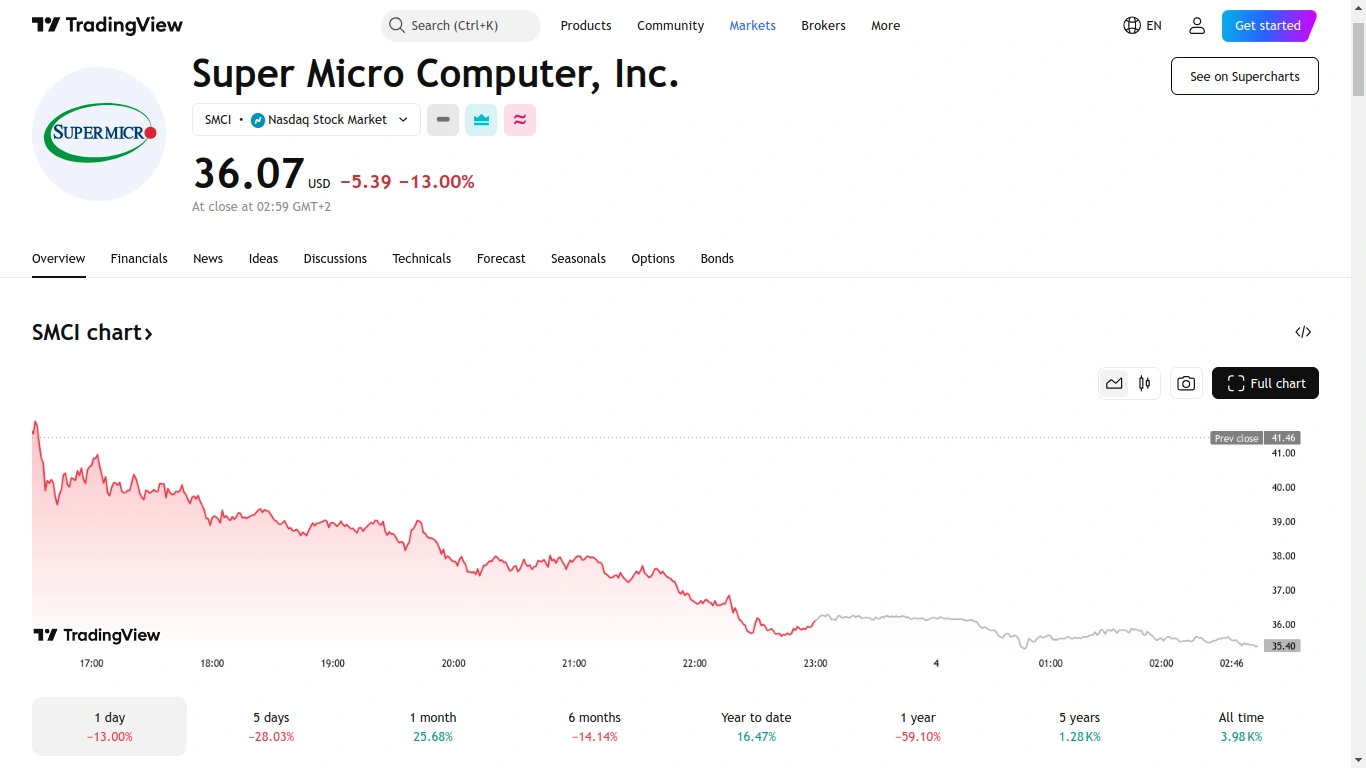 - Super Micro Computer’s stock fell sharply by 13% to $36.07, despite the company resolving its accounting compliance issues.