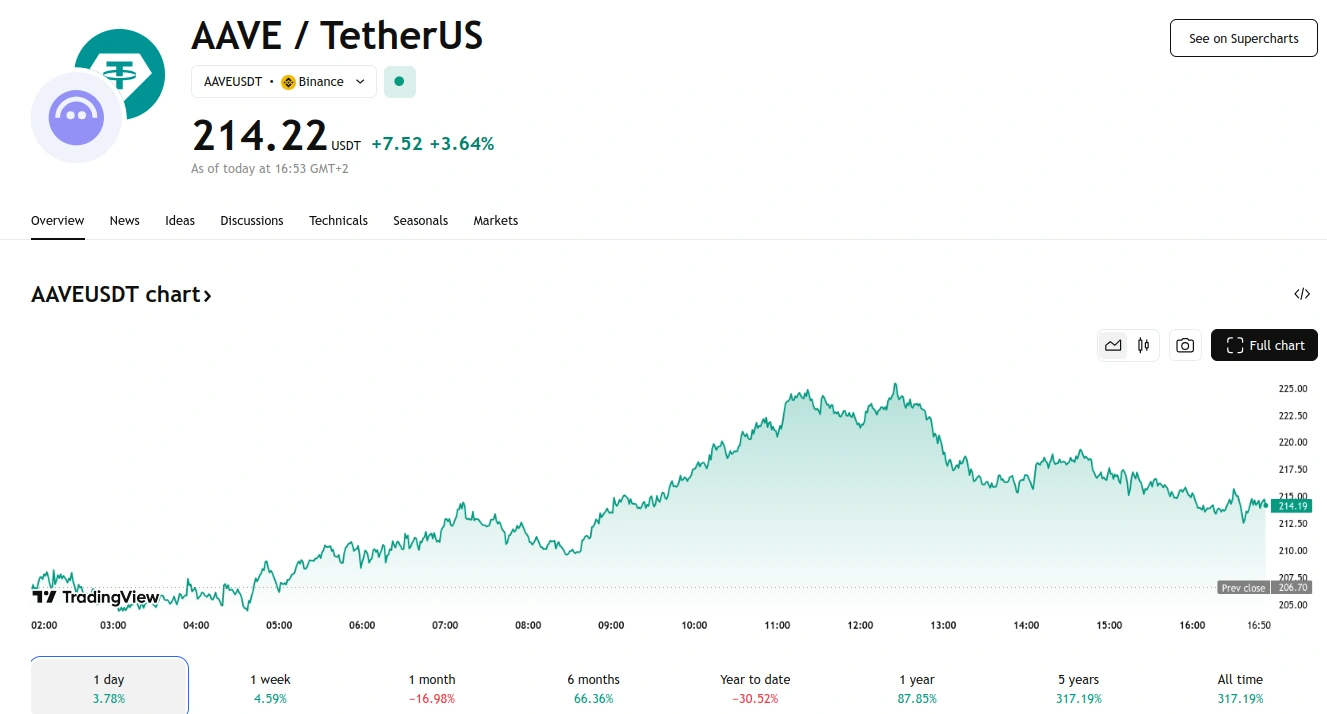 According to CoinMarketCap data, AAVE reached $220, reflecting a 26.6% increase. Its market capitalization climbed to $3.33 billion, and trading volume more than doubled to $728.45 million.