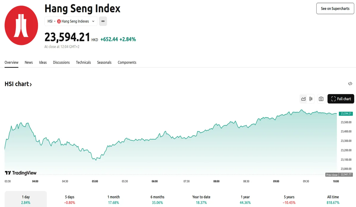 Hong Kong’s Hang Seng Index experienced a significant intraday surge, climbing by over 570 points before settling at 23,320 points by midday. This closing figure represents an increase of 378 points, or 1.65%, compared to the results at the previous market close. The trading volume on the main board reached HK$135 billion. Additionally, the Hang Seng Tech Index saw an approximate 1.9% rise, reaching a value of 5,638 points.