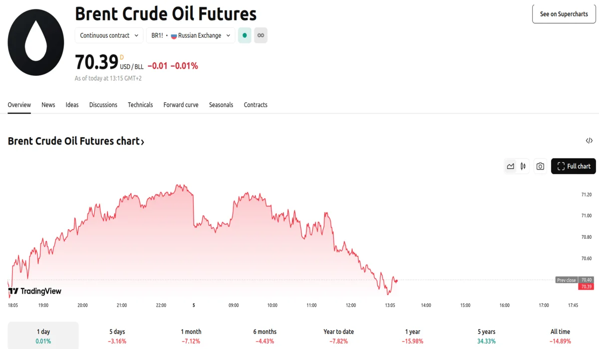 - Oil prices declined for a third consecutive session, with Brent futures falling 0.63% to $70.59 a barrel.