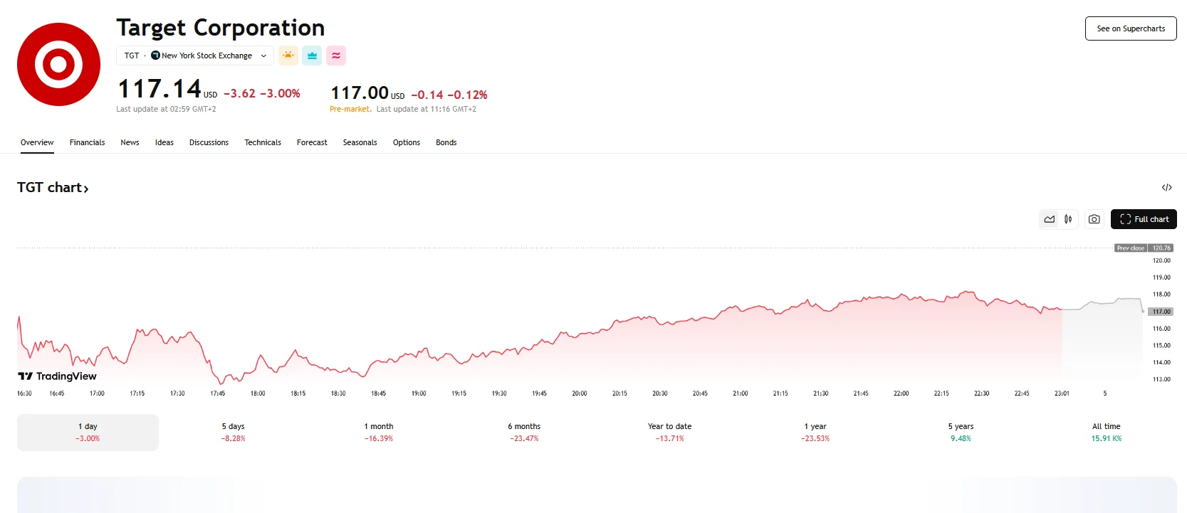 Target Corporation’s share price fell by approximately 3% and closed at $117.14 on Tuesday, a reaction to the company’s fourth-quarter earnings report and subsequent forecasts. Despite surpassing analyst expectations for both earnings and revenue, concerns surrounding potential tariff impacts and general consumer uncertainty weighed heavily on investor sentiment. The stock price recovered slightly on Wednesday, going above $117.50, before dropping once again.