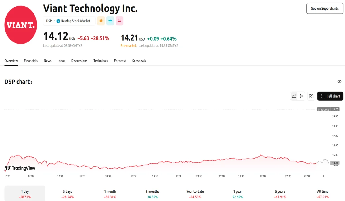 - Despite the positive financial results, Viant’s stock suffered a dramatic decrease, falling 28.51% to $14.12.