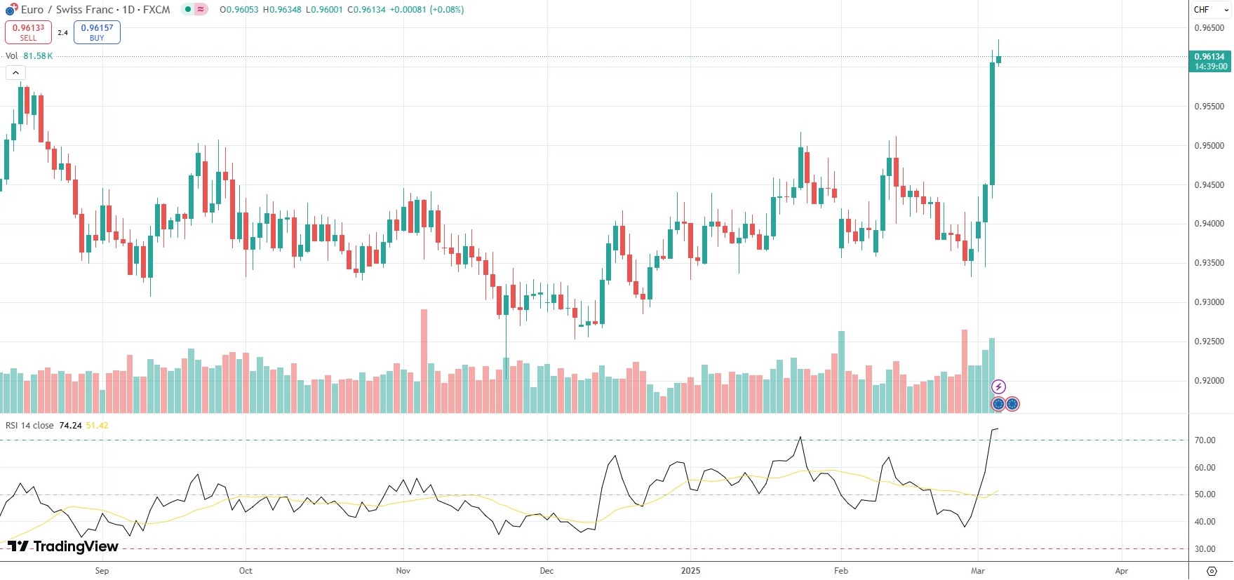Yesterday the Euro surged more than 1.6% against the Swiss Franc after reports in the media that the parties, which are to form Germany’s next government, have reached an agreement to overhaul the nation’s debt rules. The deal between the CDU-CSU and the Social Democrats is to be put before the Bundestag next week.