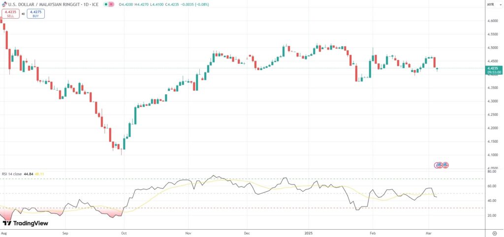 The USD/MYR currency pair was last down 0.08% on the day to trade at 4.4235. The exotic Forex pair earlier registered an intraday low of 4.4100, or its lowest level since February 26th.
