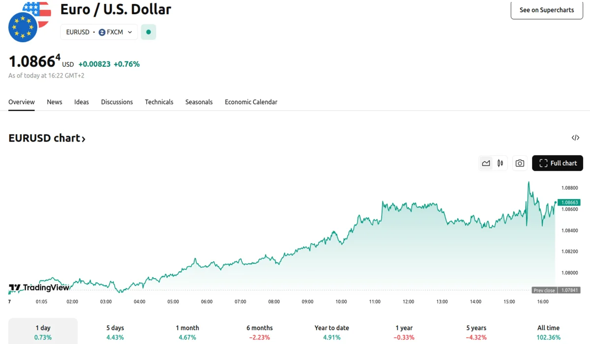 - The EUR/USD pair traded at 1.0866, marking a 0.76% increase as of 16:22 GMT+2.