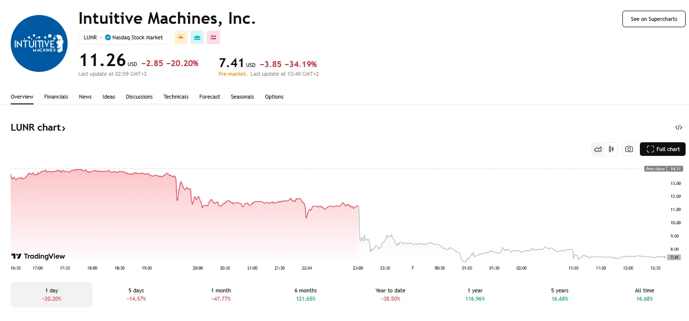 The repercussions were immediate and substantial. During the standard trading session on Thursday, Intuitive Machines shares experienced a 20% decline. However, the after-hours trading period witnessed a further plunge, with shares plummeting by more than 30%. This downward trend persisted into Friday, with the stock price reaching a low of $7.05.