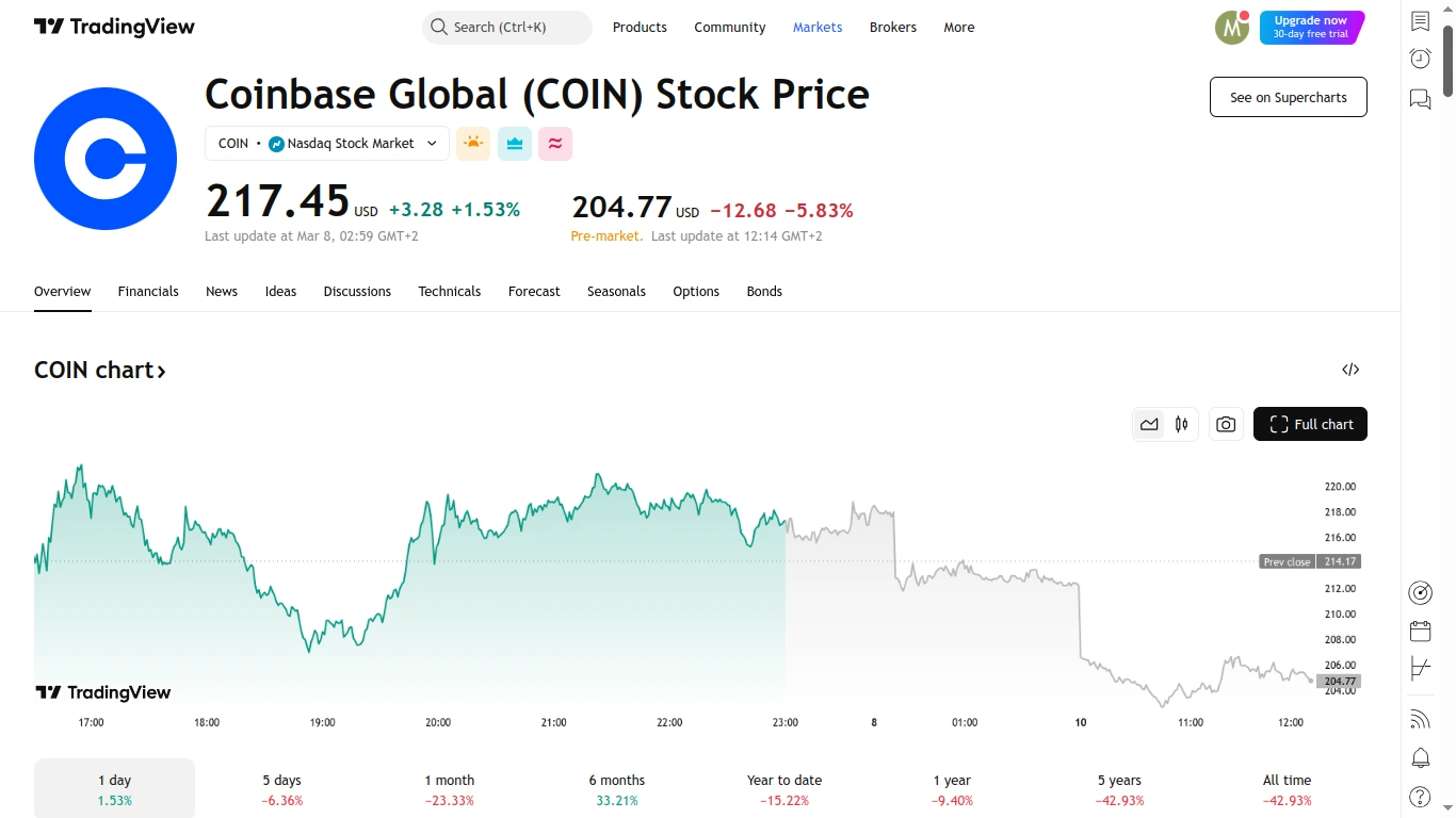 - Coinbase stock fell 5% premarket, driven by a drop in Bitcoin’s value after Trump’s executive order and the company’s failure to be included in the latest S&P 500 rebalancing.