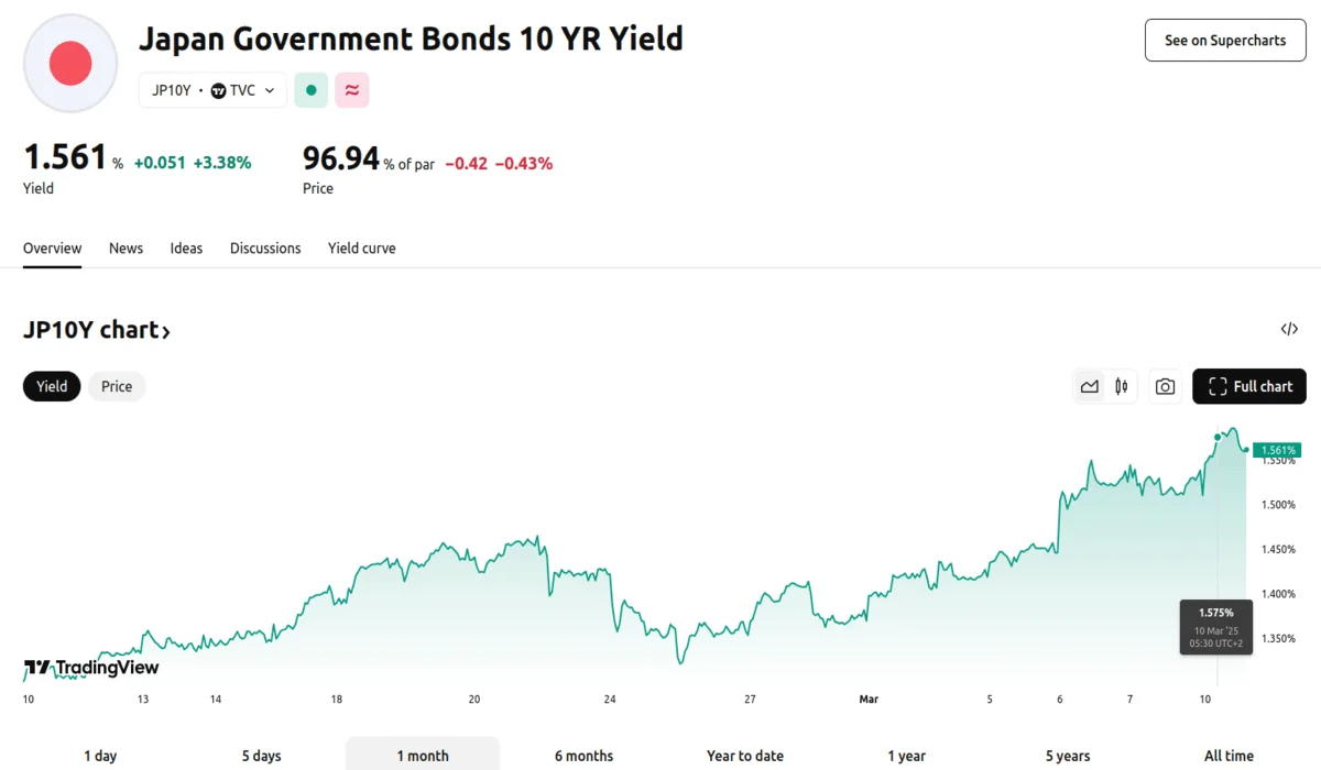- The 10-year Japanese Government Bond (JGB) yield reached 1.575%, a level unseen since October 2008.
