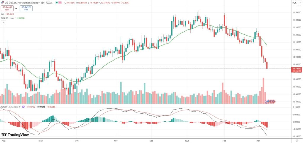 The USD/NOK currency pair was last losing 0.82% on the day to trade at 10.7477. Earlier, the exotic Forex pair went down as low as 10.7406, or its lowest level since October 14th 2024.