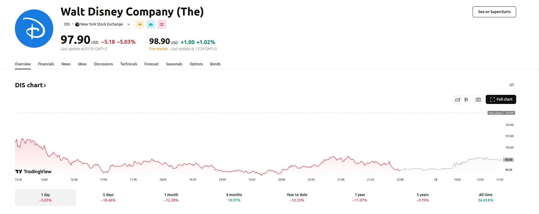 - Significant Stock Value Reduction: Disney’s stock experiences a 13.5% decrease within two weeks, marking a substantial drop unseen since November 2021.