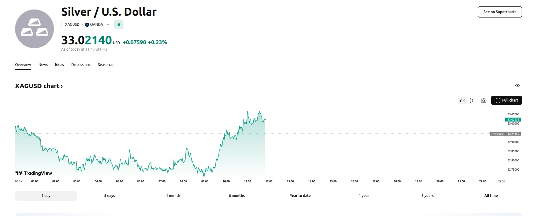 - Silver price (XAG/USD) trades near $33.00, fluctuating after recent gains.