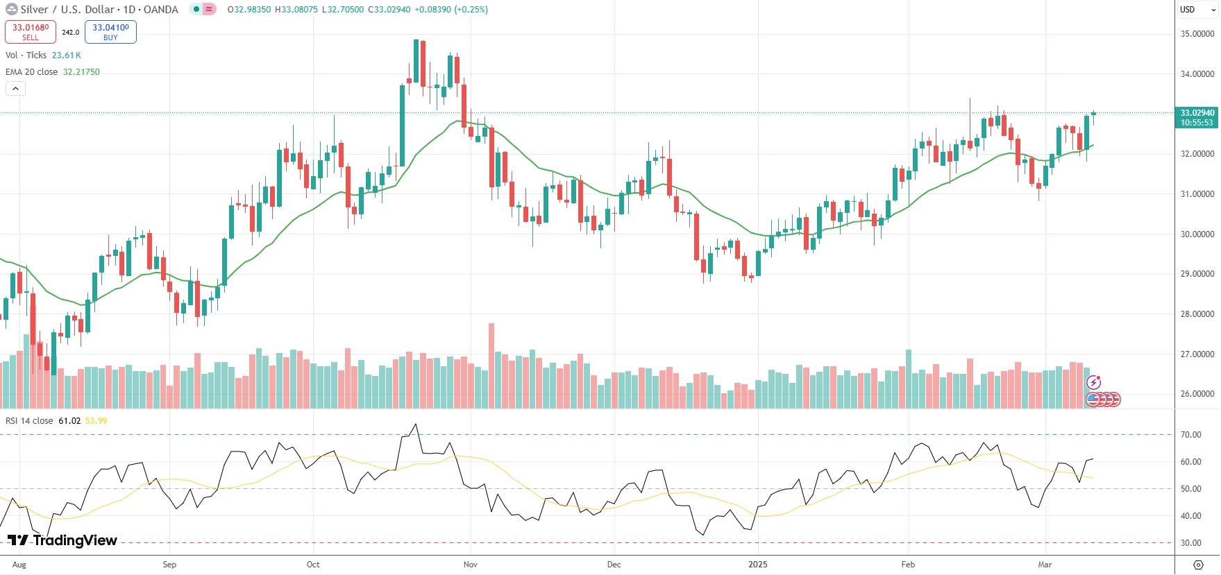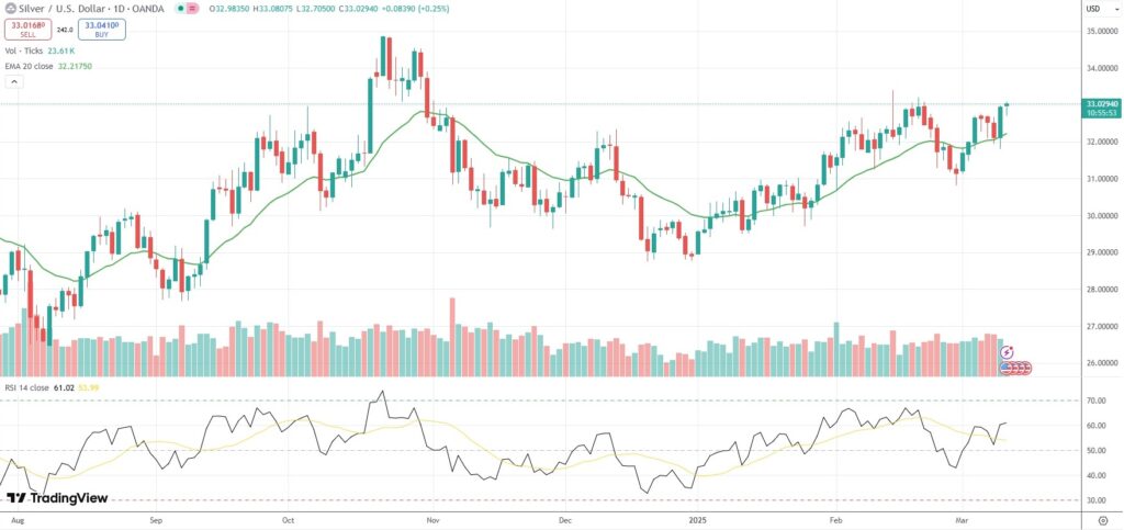 Spot Silver scaled a fresh three-week peak of $33.08 per troy ounce on Wednesday, underpinned by safe haven flows amid erratic US tariff plans that fueled concerns over global trade.