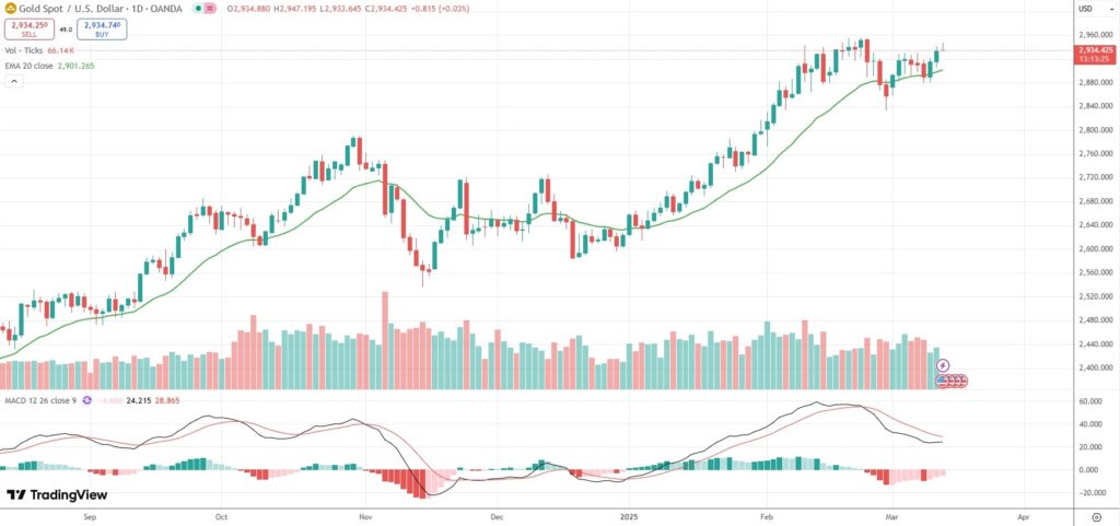 Spot Gold was last down 0.02% on the day to trade at $2,934.30 per troy ounce. It earlier touched $2,947.19 per troy ounce – its highest price level since February 25th.