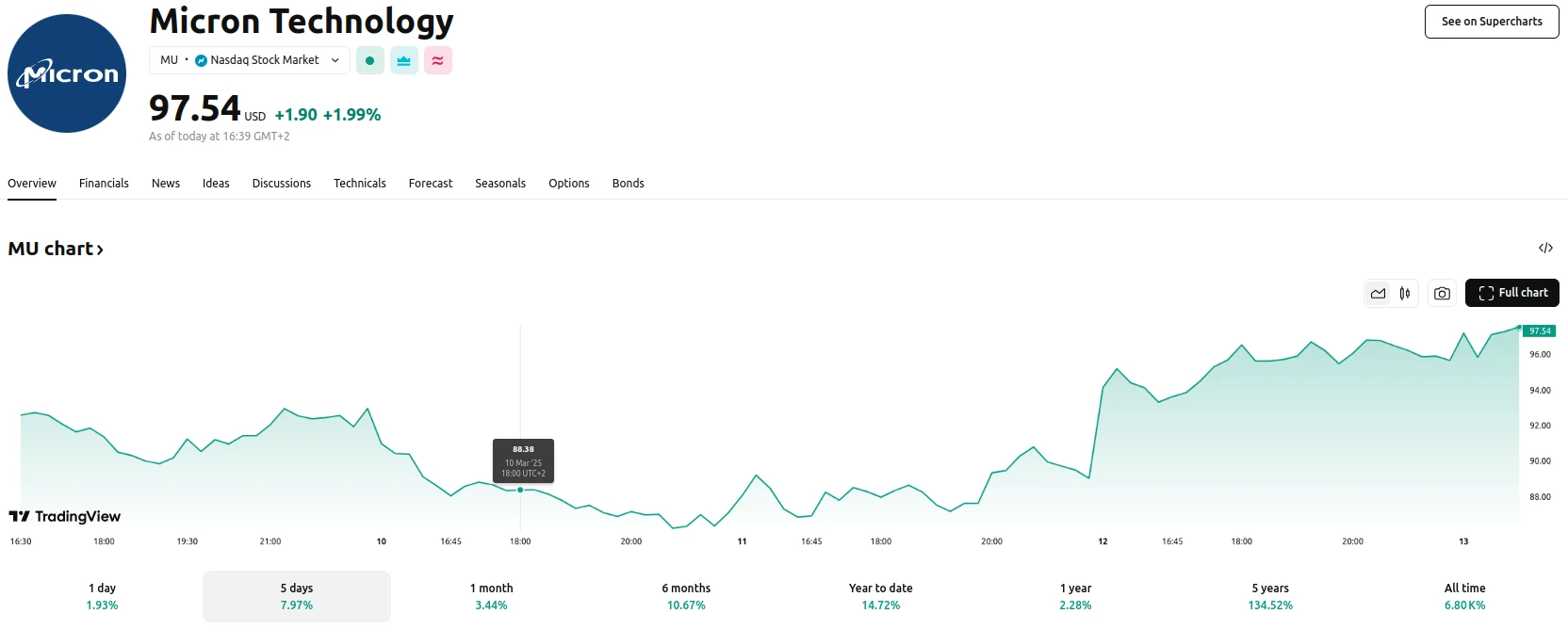 - Micron stock experienced a 7% surge following the release of the February CPI report. As of Thursday, Micron stock price is up 2%.