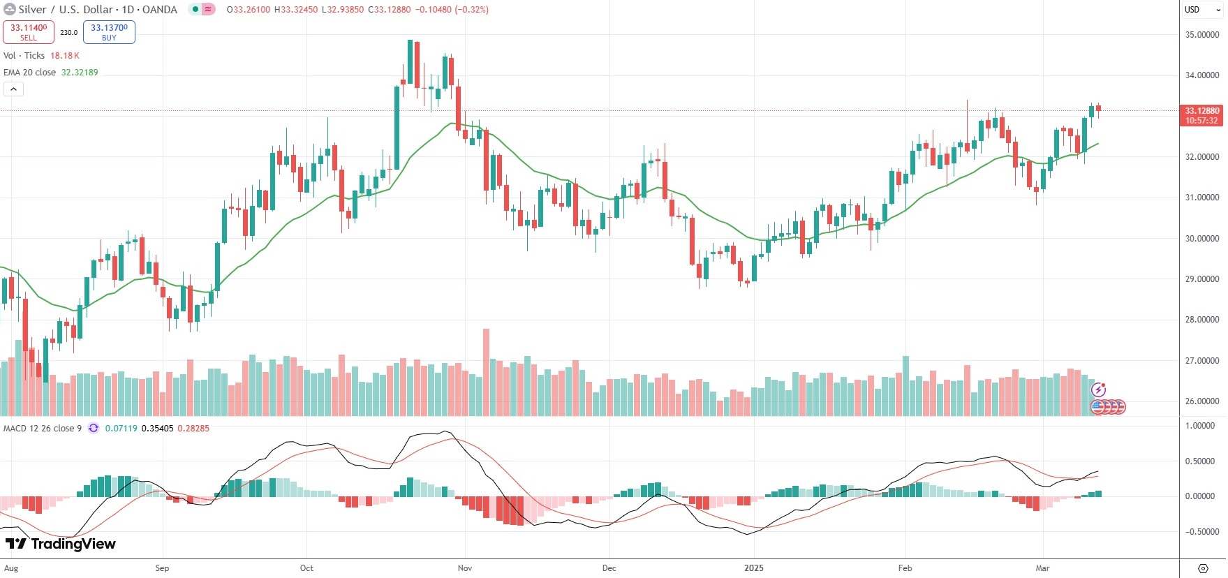 Spot Silver held not far from a one-month high of $33.32 per troy ounce on Thursday amid persisting tariff uncertainty, while US inflation eased more than expected last month, reinforcing the case for future rate cuts by the Federal Reserve.