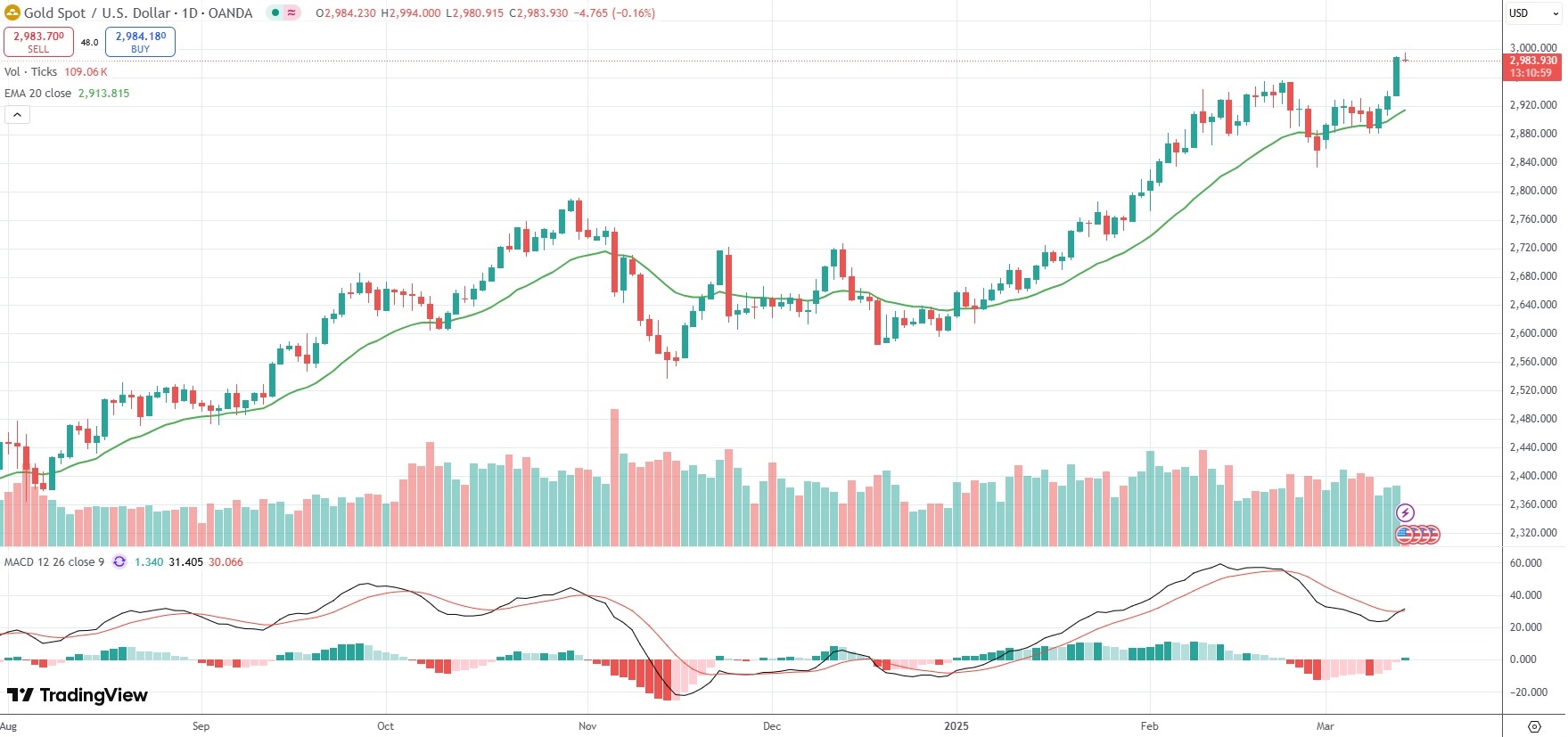 Spot Gold scaled a fresh all-time high of $2,993.80 per troy ounce on Friday amid tariff uncertainty, rising trade tensions and the prospect of interest rate cuts by the Federal Reserve.