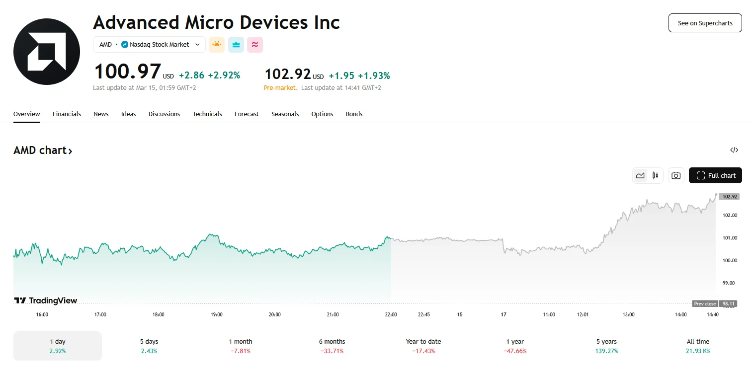 AMD’s stock experienced a positive surge as the trading week commenced, reflecting both market optimism and the company’s strategic gains in the graphics processing unit (GPU) sector. In early trading on Monday, AMD’s stock demonstrated encouraging momentum, with pre-market figures indicating a 1.93% increase, pushing the share price to $102.92, representing a rise from Friday’s closing value of $100.97. This upward trend suggests investor confidence, possibly stemming from recent reports of AMD’s growing influence in key markets.