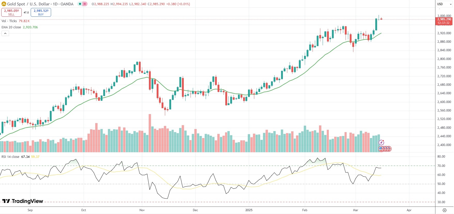 Spot Gold was last little changed on the day to trade at $2,985.14 per troy ounce.