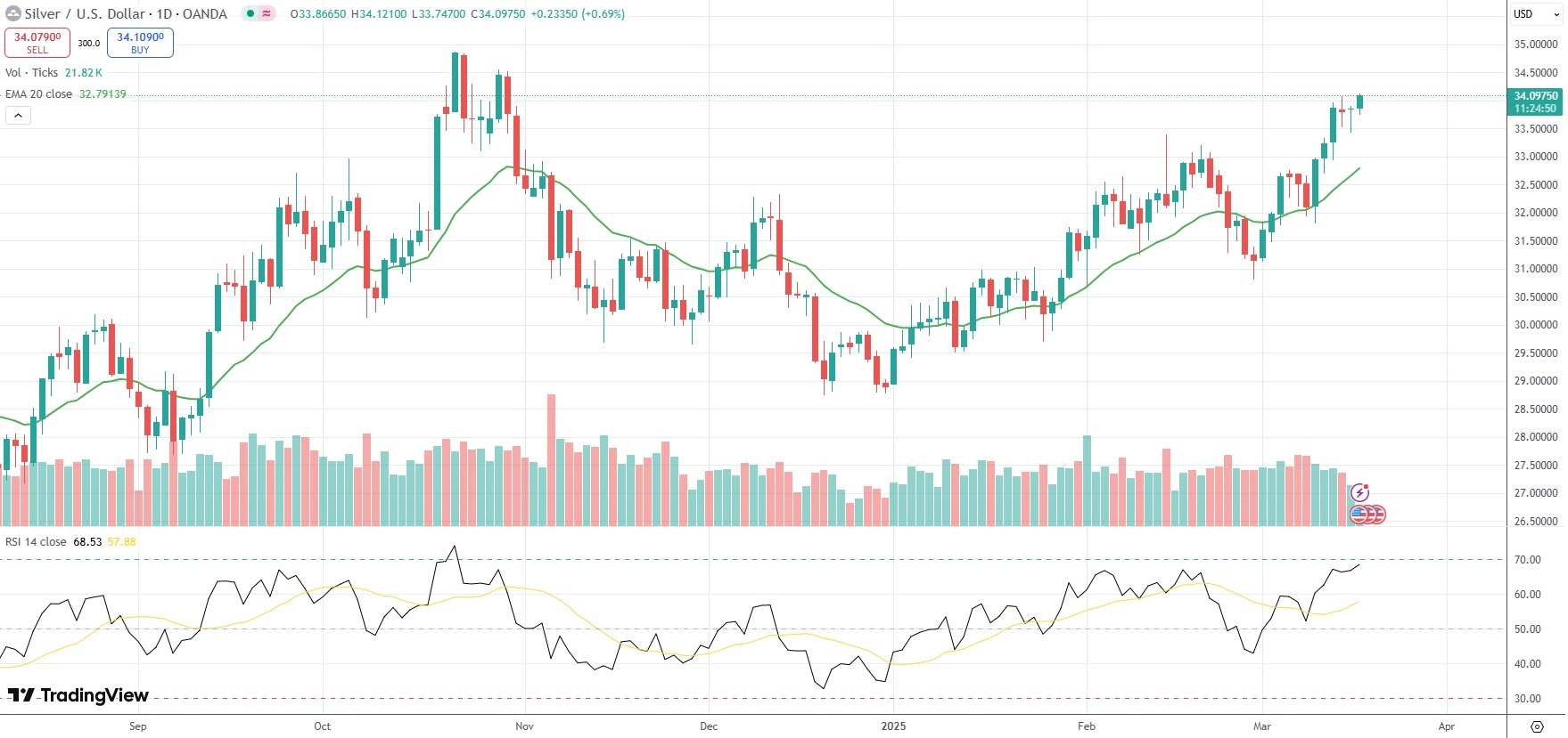 Spot Silver was last up 0.70% on the day to trade at $34.10 per troy ounce. Earlier, the commodity went up as high as $34.12, or its highest price level since October 30th 2024.