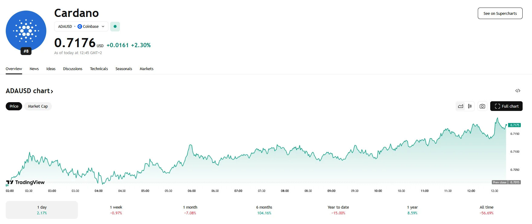 - Cardano’s ADA price surged 2.30% to surpass $0.71 on Wednesday, backed by a $25.16 billion market cap.