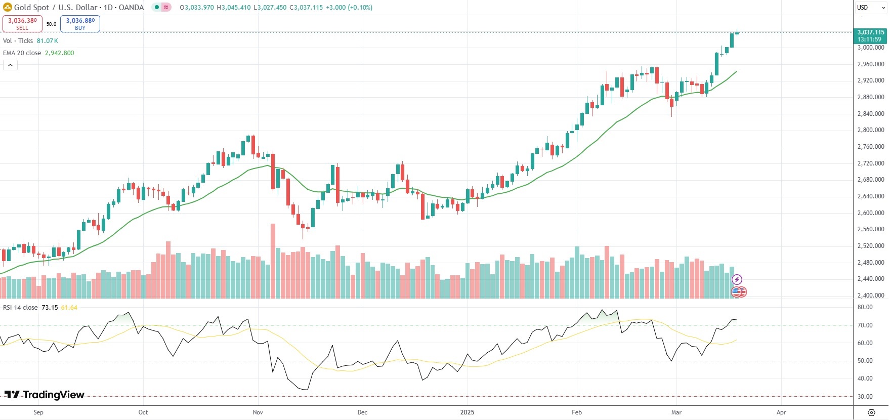 Spot Gold extended its rally to yet another record high of $3,045.41 per troy ounce on Wednesday, as geopolitical developments in the Middle East and global trade fears underpinned safe haven demand ahead of the outcome of the Federal Reserve’s policy meeting.