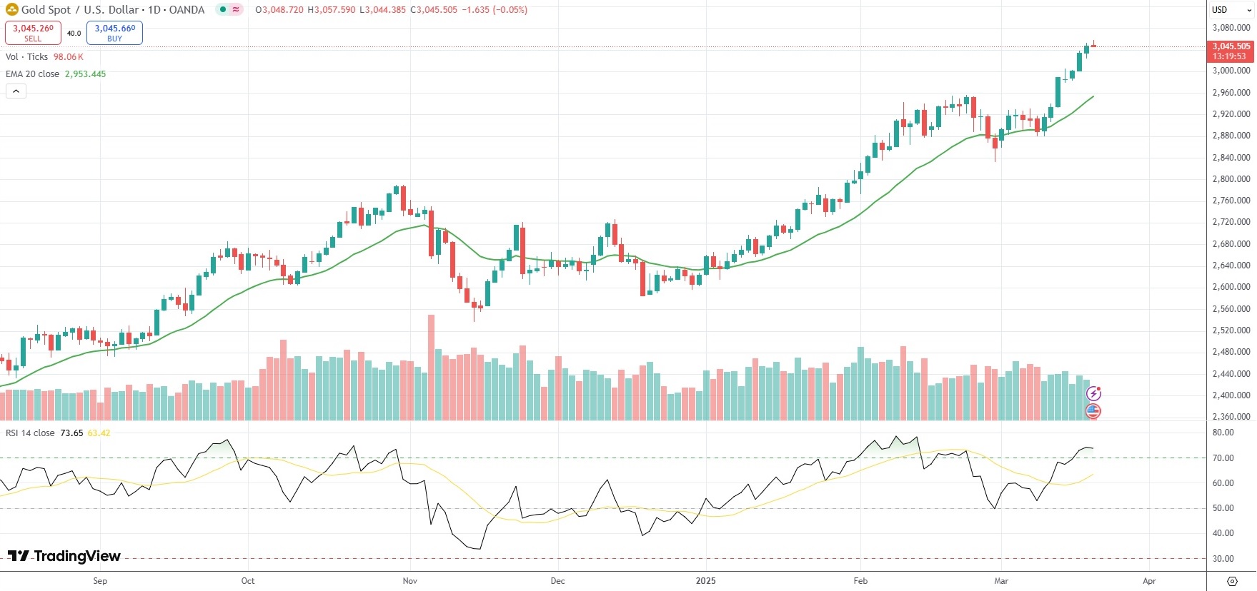 Spot Gold extended its rally to a fresh record high of $3,057.21 per troy ounce on Thursday, after the Federal Reserve flagged two potential interest rate cuts by the end of 2025, further heightening the appeal of the safe haven metal.