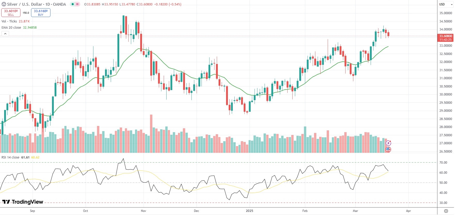 Spot Silver was last losing 0.50% on the day to trade at $33.62 per troy ounce.