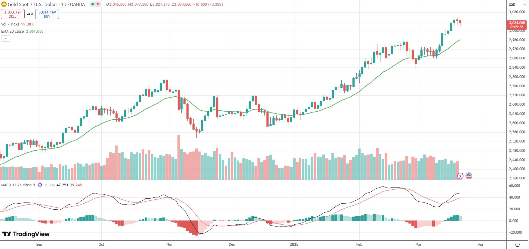 Spot Gold was last down 0.35% on the day to trade at $3,034.05 per troy ounce.