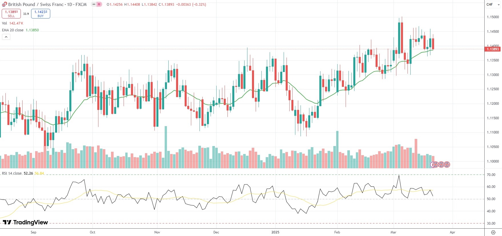 The GBP/CHF currency pair settled 0.32% lower at 1.1389 on Friday.
