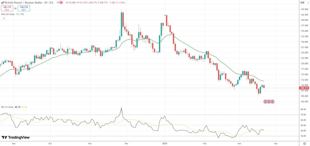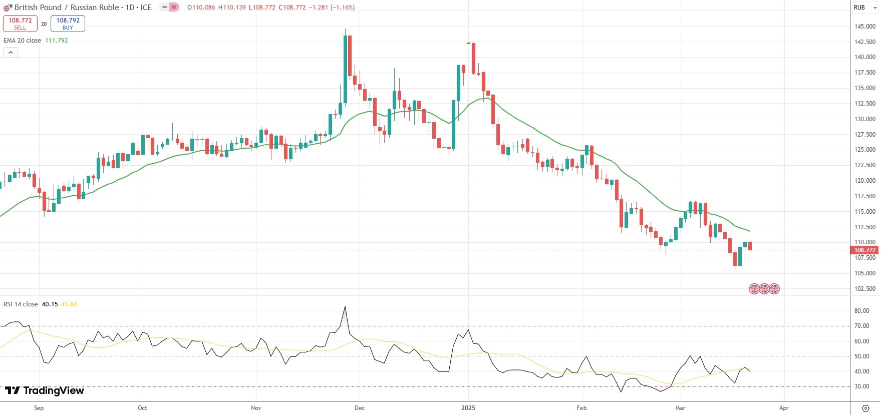 The GBP/RUB currency pair settled 1.16% lower at 108.772 on Friday.
