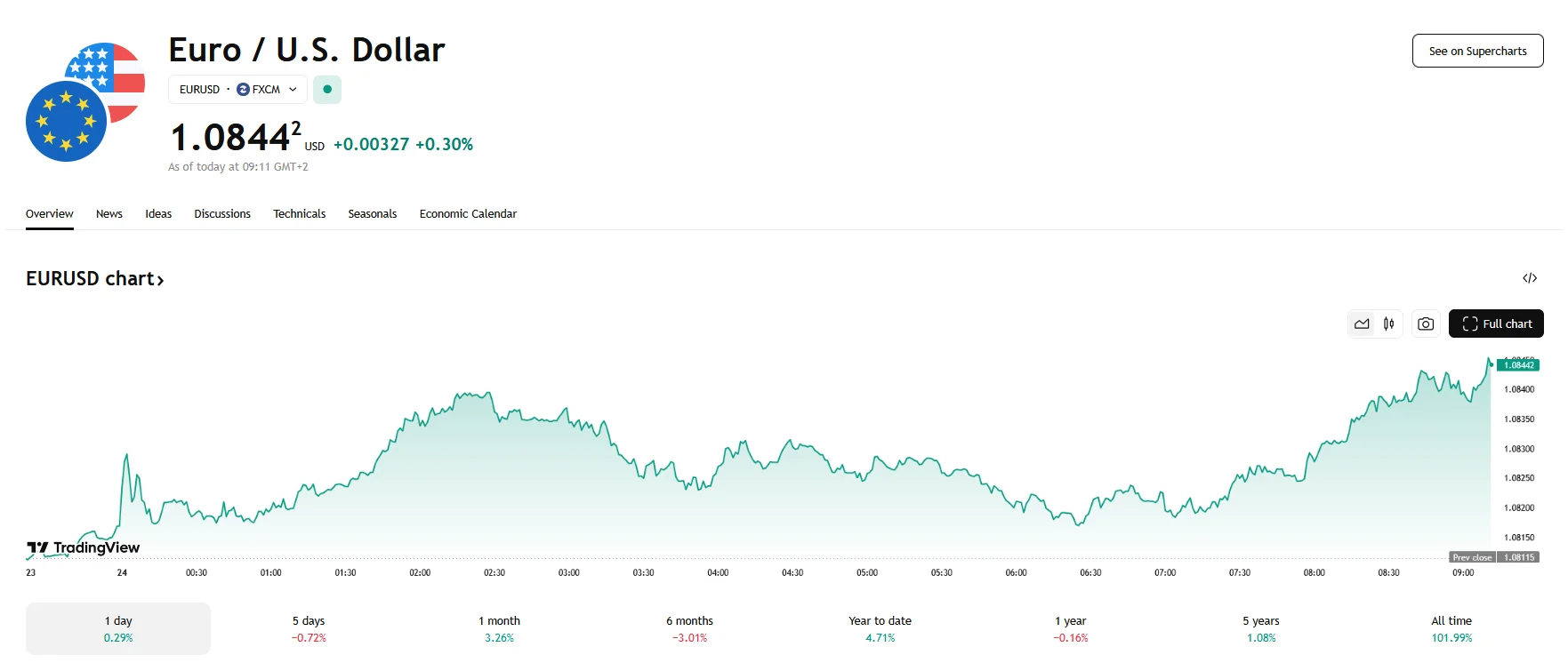 The foreign exchange market witnessed notable shifts on Monday as the Euro climbed against the U.S. dollar. The EUR/USD pair registered a 0.30% increase to a level of 1.0844. Simultaneously, the Dollar Index, a metric focusing on the dollar’s value against other major currencies, retreated below the 104 threshold, reaching 103.969 after a 0.17% decrease.