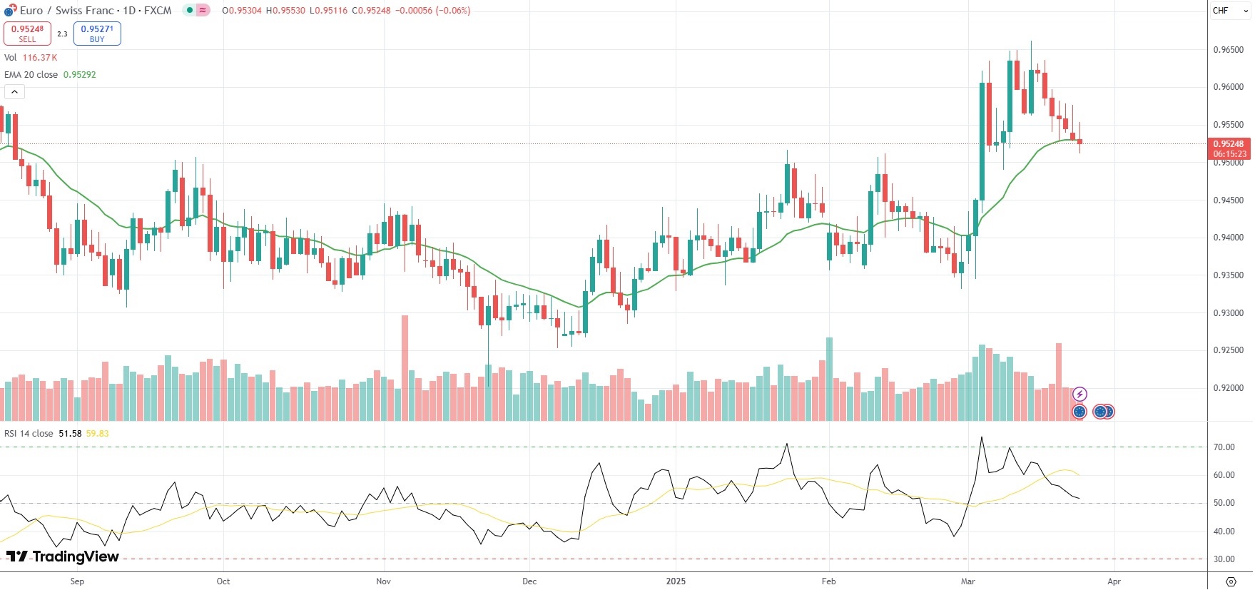 The EUR/CHF currency pair traded just above a fresh two-week low of 0.9511 on Tuesday, as uncertainty regarding the upcoming round of US tariffs continued to underpin safe haven currencies such as the Franc, while data showed Germany’s business climate had improved in March.