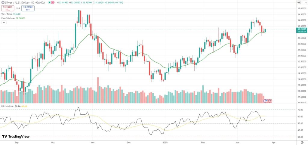 Spot Silver held above the $33 mark on Tuesday, bouncing off 1 1/2-week low, amid ongoing uncertainty regarding the upcoming round of US tariffs, which drove safe-haven demand.
