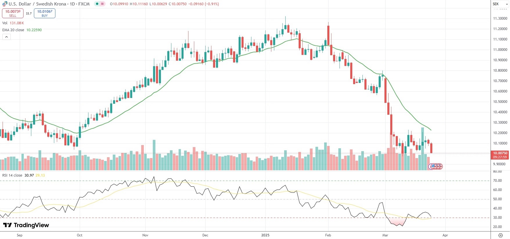 The USD/SEK currency pair hovered just above a fresh two-week low of 10.0063 on Tuesday, as market players’ main focus was the upcoming reciprocal tariffs, promised by the Trump administration on April 2nd.