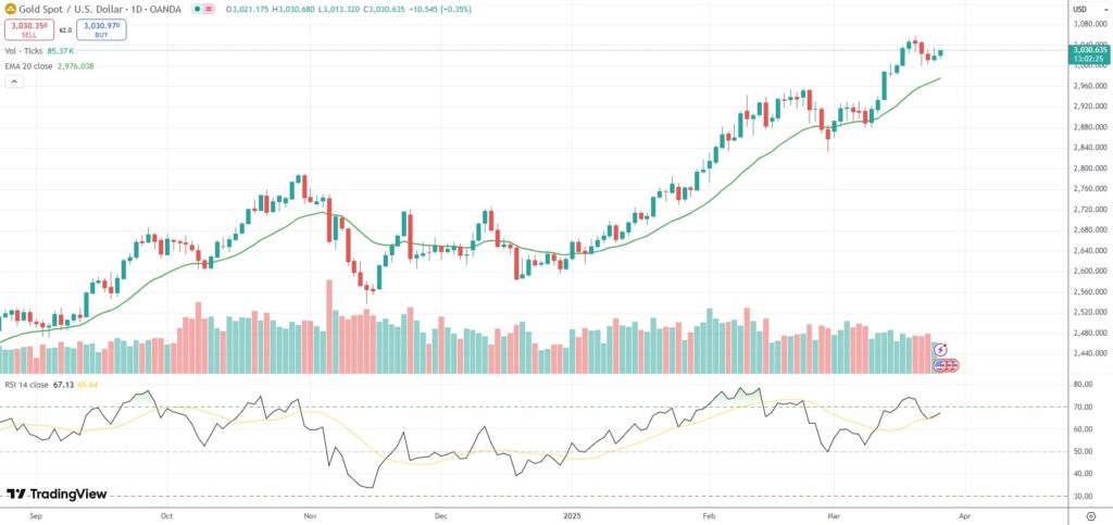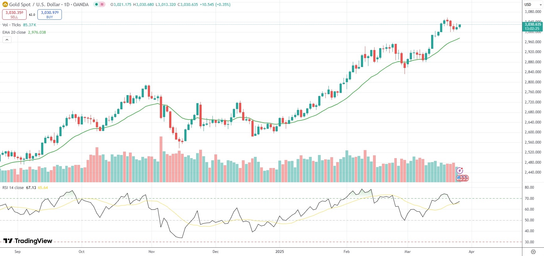 Spot Gold was last up 0.34% on the day to trade at $3,030.43 per troy ounce.