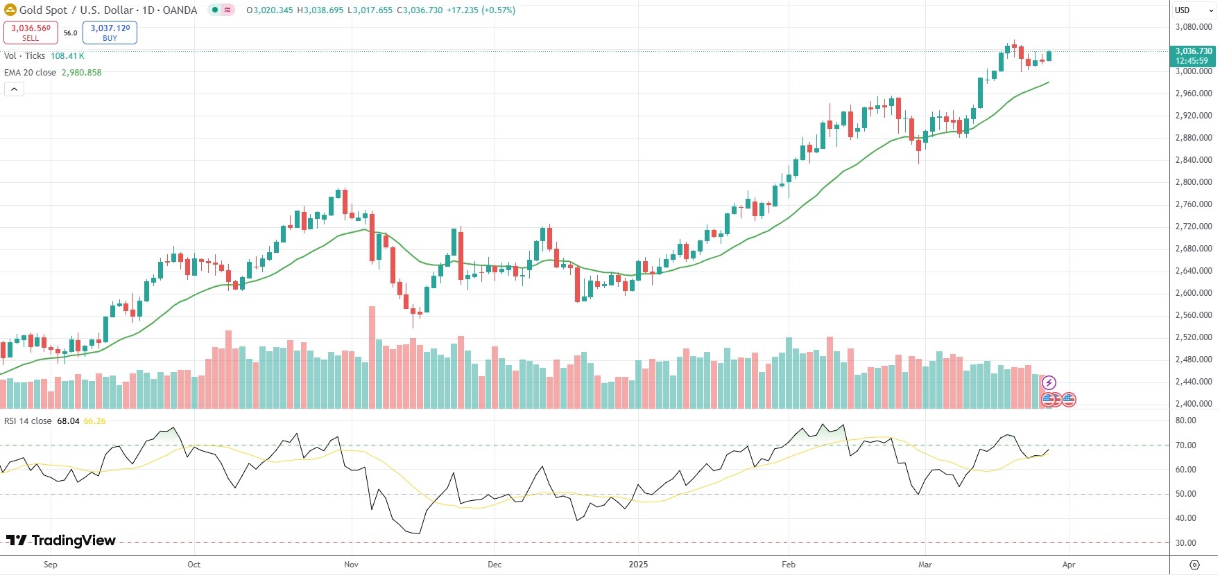 Spot Gold was last up 0.57% on the day to trade at $3,036.62 per troy ounce.