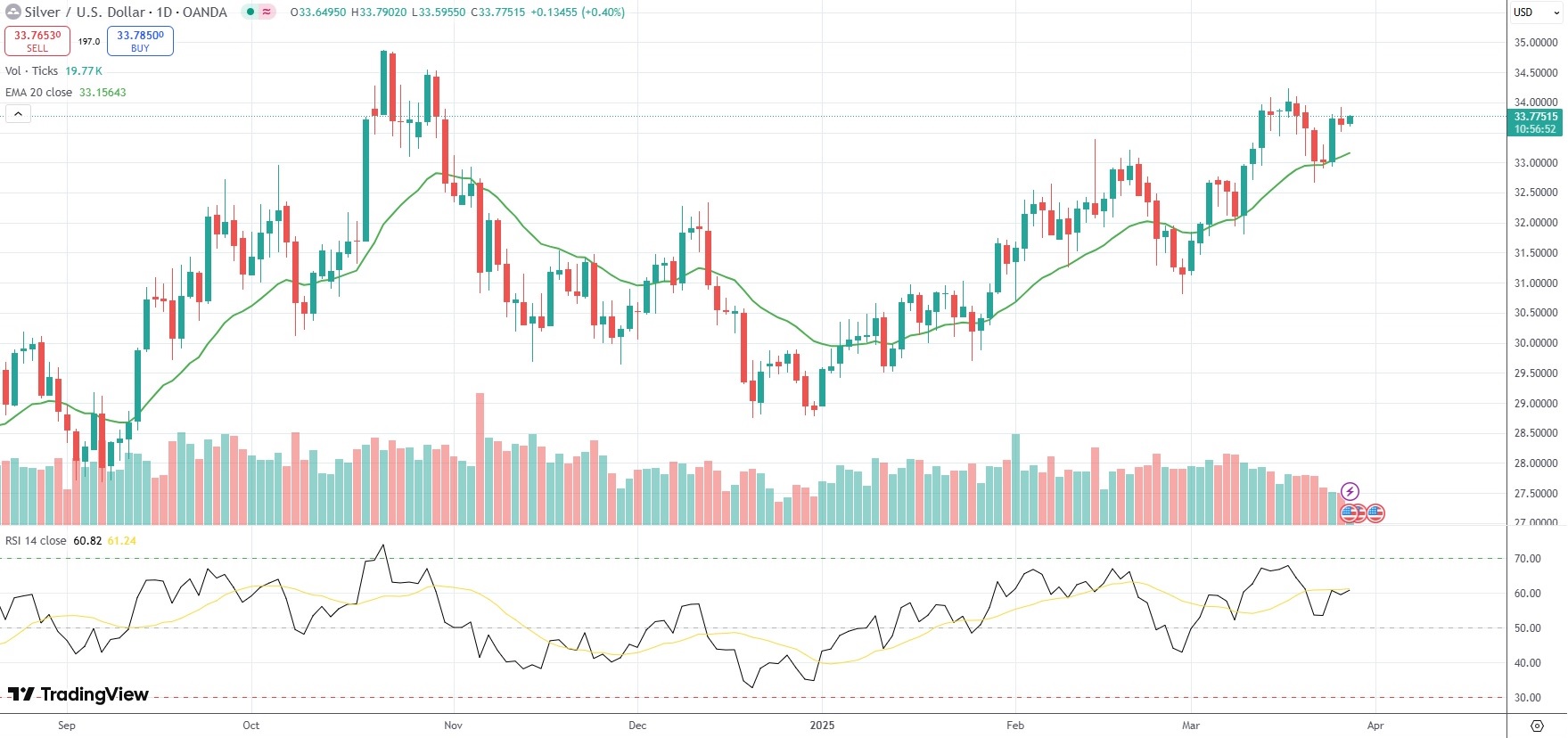 Spot Silver traded in proximity to a one-week high of $33.93 per troy ounce on Thursday and the US Dollar softened, as fresh US auto tariffs added to global trade tensions, fueling demand for safe haven assets.